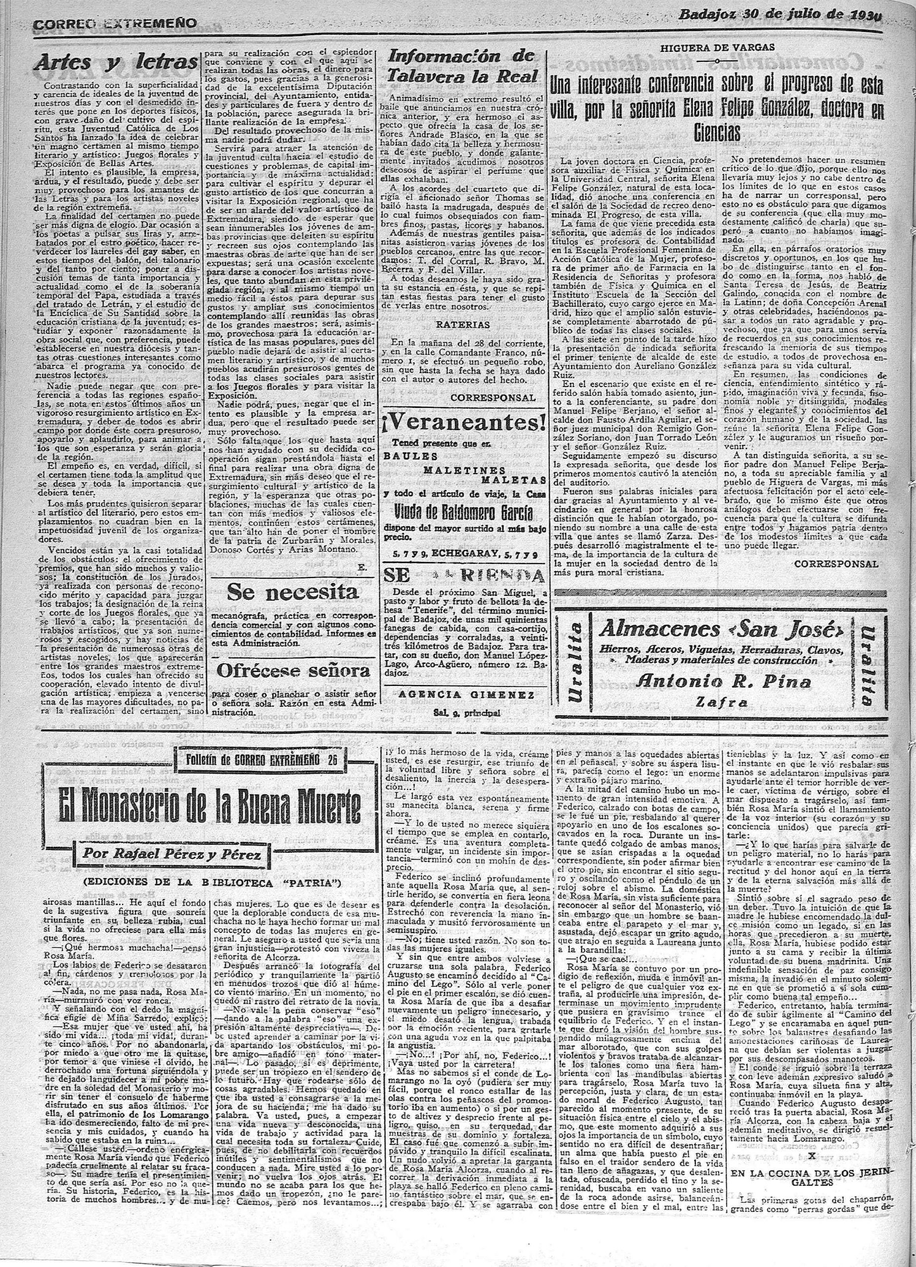 El Periódico “ El Correo Extremeño “ Diario editado en Badajoz entre 1926/7 y 1931 cuyo Director fué el intelectual José Lòpez Prudencio se hace eco de dicha conferencia: